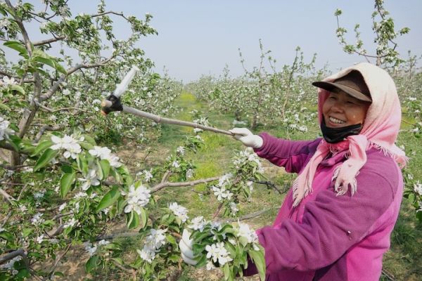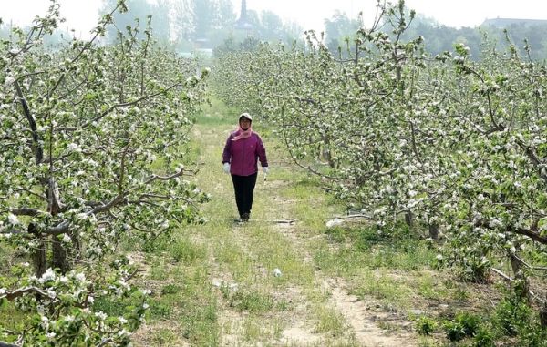 2日,在台安县西平林场的果园内,果农正在对苹果树进行人工授粉,林场内25000亩沙地寒富苹果进入盛花期。